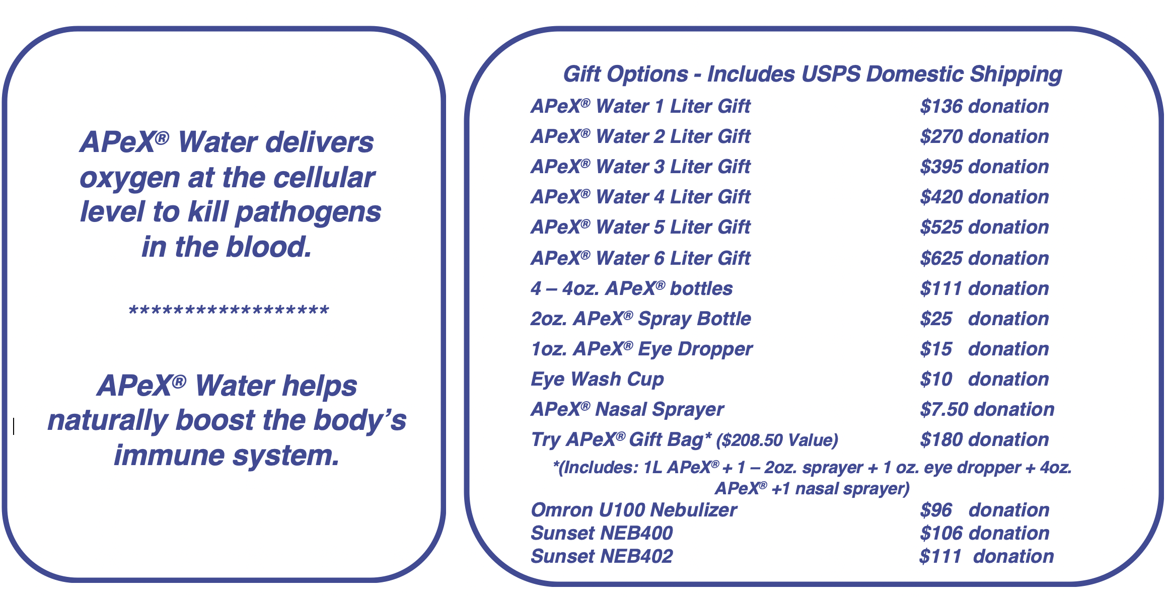 The key to APeX® Water is that oxygen molecules are bonded to the silver core, by a Covalent Bond, and delivered through the use of the silver nuclei, past the cell membrane, and into the heart of the pathogenic cell. APeX® Water is a direct cellular infusion, oxygen delivery system®. It has the ability to specifically rout out pathogenic cells, and then one-by-one, destroy them, without any toxic residue to healthy cells. APeX® Water helps build healthy blood cells, thereby boosting the immune system.